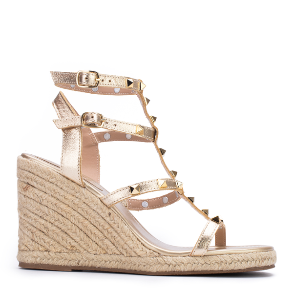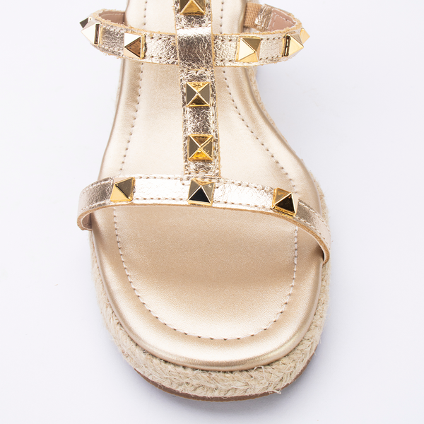 Sandália Anabela Lia Line que combina glamour e conforto em um único modelo. O acabamento metalizado traz brilho na medida certa, enquanto as tiras com studs dourados adicionam um toque fashion e moderno. O salto em corda natural eleva o visual com leveza, garantindo estabilidade e conforto para usar do dia à noite com muito estilo.
